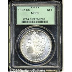 <B>1892-CC<S$1> MS65 PCGS.</B></I> Wisps of apricot color occasionally visit this otherwise untoned example. Booming luster illuminates the carefully preserved surfaces. A boldly struck Gem of this penultimate Carson City issue, which did not surface in quantity within the GSA hoard unlike its brethren from the early to mid 1880s. Encapsulated in an old green label holder. <BR><BR><B>Important notice:</B> Heritage usually auctions material at the rate of 200-250 lots per hour. On some occasions eBay Live bid software or the Internet may not be able to keep up with the pace of the auction. We recommend placing a realistic absentee bid now as insurance to avoid disappointment. Occasionally the auctioneer may eliminate or reject an eBay Live bid, and the auctioneer may also reopen a lot after the close of the eBay live bidding (usually because we missed an audience bid), and may reject your bid even if it shows you as the winning bidder. By bidding via eBay Live, you agree that Heritage may award the lot to another bidder at its sole discretion under the circumstances described above or any other reasonable circumstances. Since eBay bids are not shown to us until we open the lot on the floor, we treat those bids just like floor bids. In most cases the floor responds before the eBay bid is presented to us, due to Internet lag time, so for consistency we have made it a policy that floor bids are always considered first over tie eBay live bids. Also please note that all Heritage lots purchased through eBay Live carry a 20% Buyer's Premium. Please make sure you read the Terms and Conditions before you bid. </span></font></tr></table></td></tr></table>