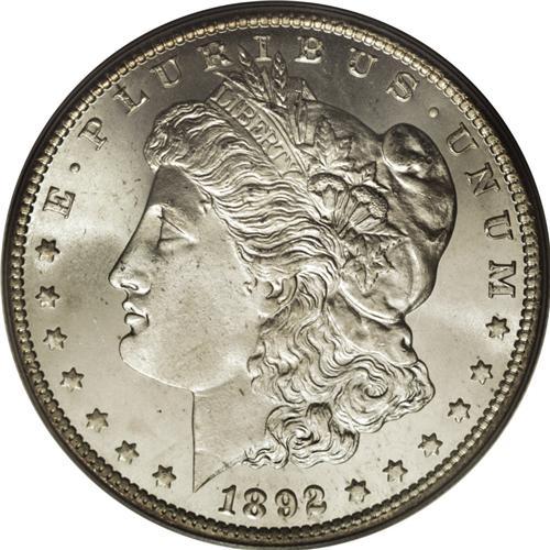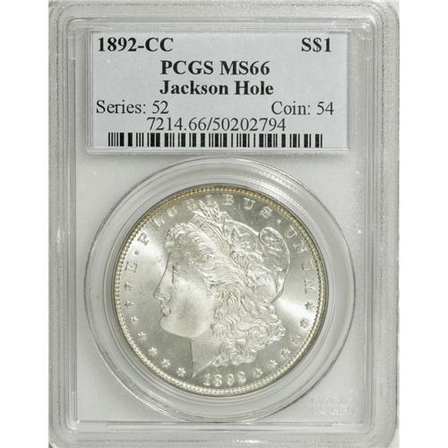 <B>1892-CC S$1 MS66 PCGS.</B></I> Ex: Jackson Hole. Both sides of this amazing Premium Gem have frosty luster with exquisite surfaces. This piece is sharply struck with essentially full details on each side. More than 1 million of these coins were struck (the official quantity was 1,352,000 coins), and most were stored at Carson City and later moved to San Francisco. The majority were paid out from the San Francisco Mint during the 1920s through early 1950s and entered circulation. A small quantity went to the Treasury in Washington, D.C., where they were paid out as well, largely entering numismatic circulation. By the time of the GSA sales in the 1970s, the supply of this date was entirely dried up. Population: 20 in 66, 2 finer (2/07).<BR><I>From The Jackson Hole Collection.</B></I><BR><BR><b>Shipping:</b> Coins & Currency (<a target="_blank" href="http://www.heritageauctions.com/common/shipping.php">view shipping information</a>)