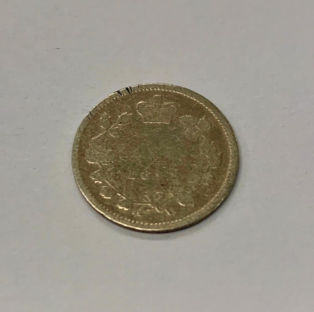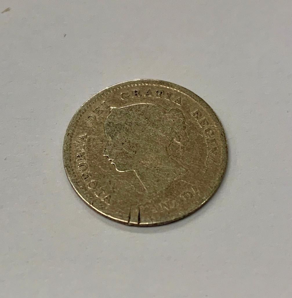 Obverse The portrait in left profile of Victoria is surrounded with the inscriptions "CANADA" and "VICTORIA DEI GRATIA REGINA" (Victoria, Queen by the grace of God) Lettering: VICTORIA DEI GRATIA REGINA. CANADA Reverse The facial value is surrounded with two maple boughs and the crown of Queen Victoria Lettering: 5 CENTS 1858 Features TypeStandard circulation coin Years1858-1901 Value5 Cents (0.05 CAD) MetalSilver (.925) Weight1.167 g Diameter15.494 mm Thickness0.70 mm ShapeRound OrientationCoin alignment ??