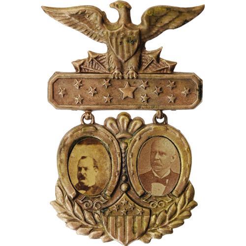 <B>Rare 1892 Cleveland & Stevenson Jugate Photo Badge.</B></I> All Cleveland & Stevenson jugates are rare, and this version, using a frame quite familiar for several other tickets, is unlisted and not seen before by us. Great condition, with original pin on rever. 1.25" x 2.25".
