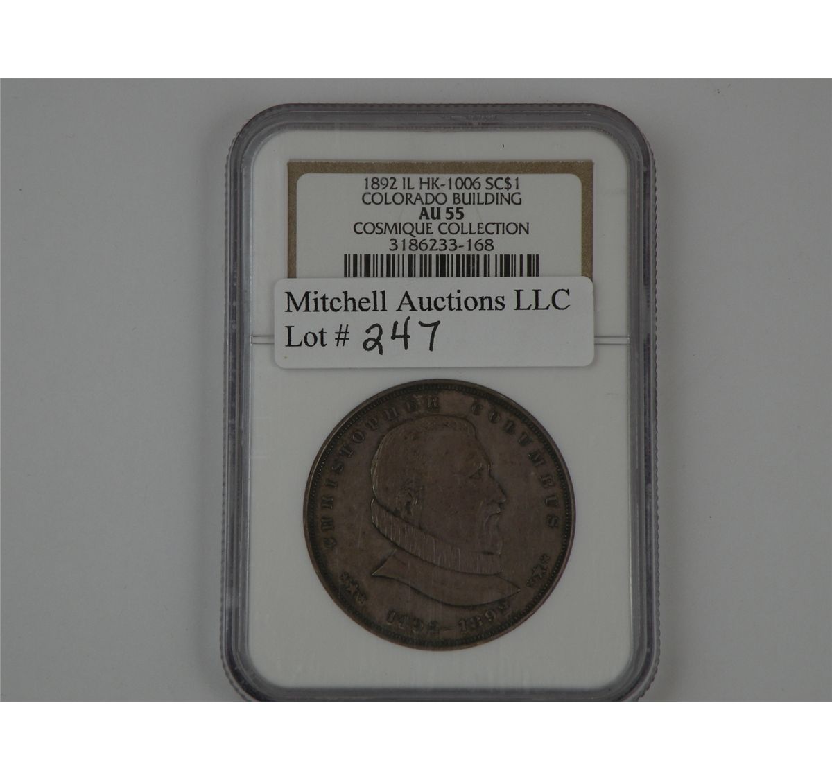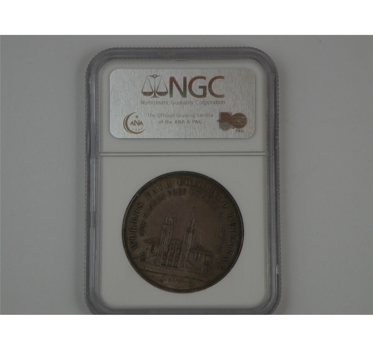 1892 Columbian Exposition Medal and So-Called Dollar. Silver, 37mm. HK- 1006, Eglit- 497. Bearded Columbus facing right/ Colorado Building. Extremely RARE. Only 5-10 pieces estimated to exist in the 2008 edition of Hibler-Kappen. This Colorado Building Dollar grades NGC AU55 with medium grey toning on either side. Est.$3,000