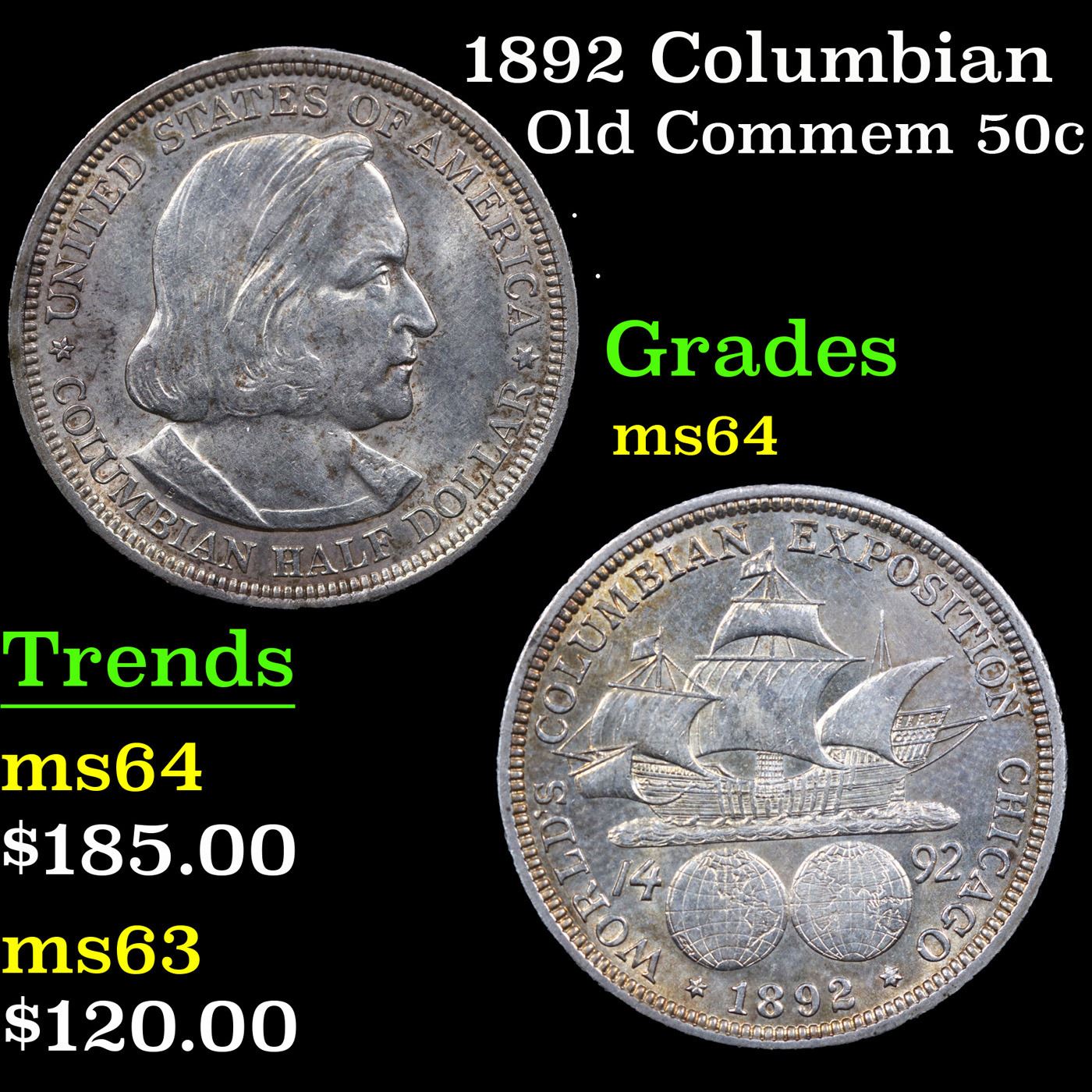1892 Columbian Old Commem Half Dollar 50c Grades Choice Unc. The Columbus Half Dollar along with the Isabella Quarter were Minted in Honor of the 400th Anniversary of Columbus' Voyage to the New World. It was First Distributed at the Worlds Fair Honoring that Voyage. When Examining a Columbian Exposition Half Dollar, the First Points to Show Wear are Columbus’ Eyebrow, Cheek and the Hair Behind his Forehead and Jaw. On the Reverse, Check the Foresail and Sainsail, as well as the Right Side of the Eastern Hemisphere.