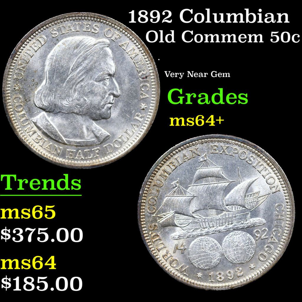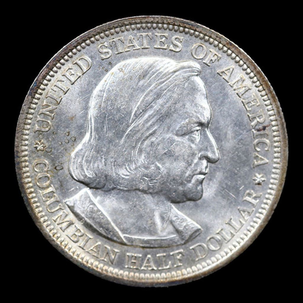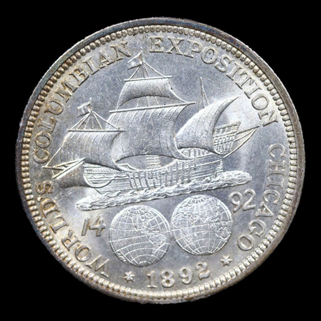 1892 Columbian Old Commem Half Dollar 50c Grades Choice+ Unc. The Columbus Half Dollar along with the Isabella Quarter were Minted in Honor of the 400th Anniversary of Columbus' Voyage to the New World. It was First Distributed at the Worlds Fair Honoring that Voyage. When Examining a Columbian Exposition Half Dollar, the First Points to Show Wear are Columbus’ Eyebrow, Cheek and the Hair Behind his Forehead and Jaw. On the Reverse, Check the Foresail and Sainsail, as well as the Right Side of the Eastern Hemisphere.