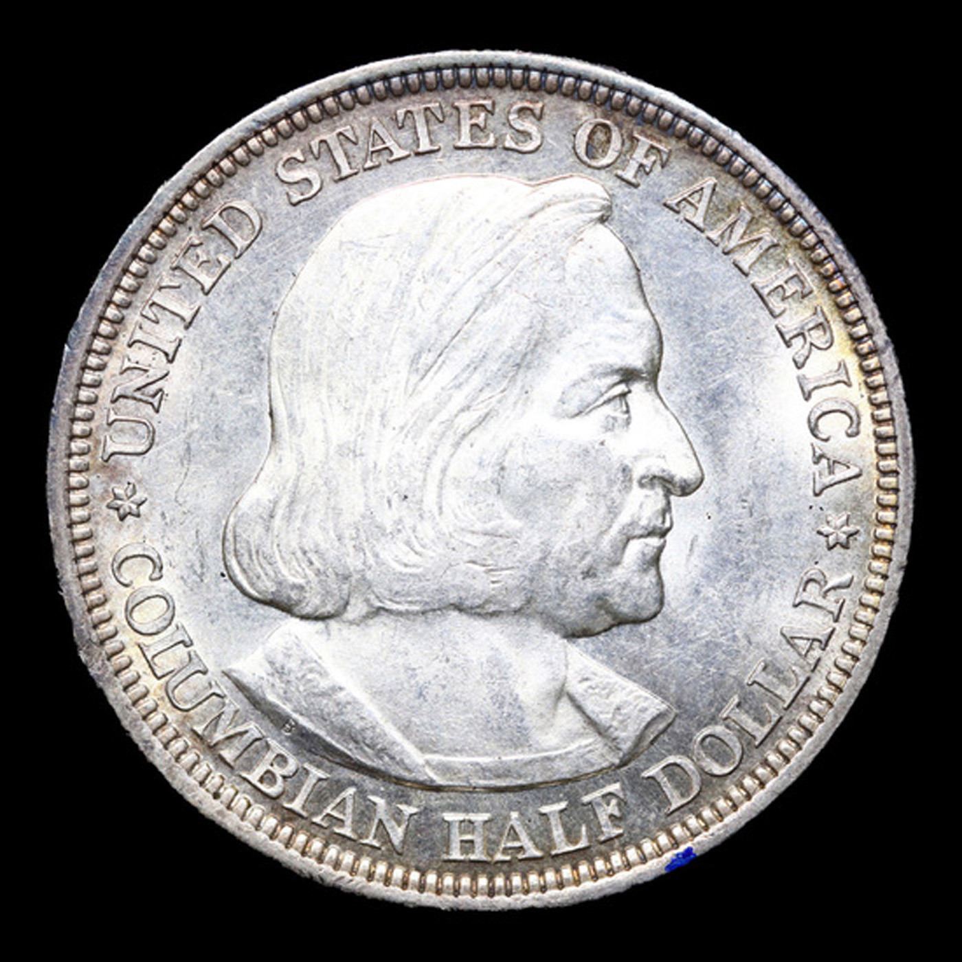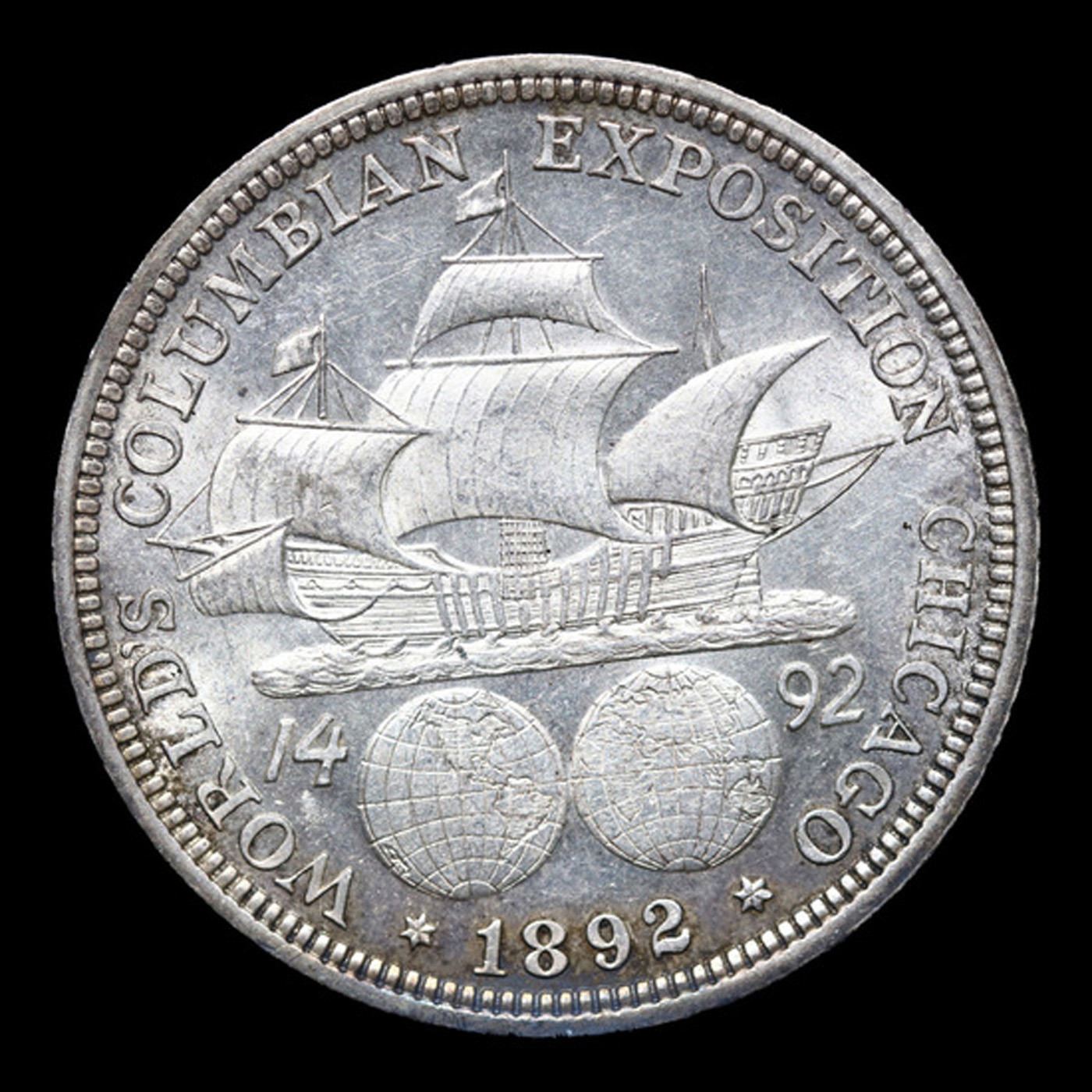 1892 Columbian Old Commem Half Dollar 50c Grades GEM Unc. The Columbus Half Dollar along with the Isabella Quarter were Minted in Honor of the 400th Anniversary of Columbus' Voyage to the New World. It was First Distributed at the Worlds Fair Honoring that Voyage. When Examining a Columbian Exposition Half Dollar, the First Points to Show Wear are Columbus’ Eyebrow, Cheek and the Hair Behind his Forehead and Jaw. On the Reverse, Check the Foresail and Sainsail, as well as the Right Side of the Eastern Hemisphere.