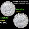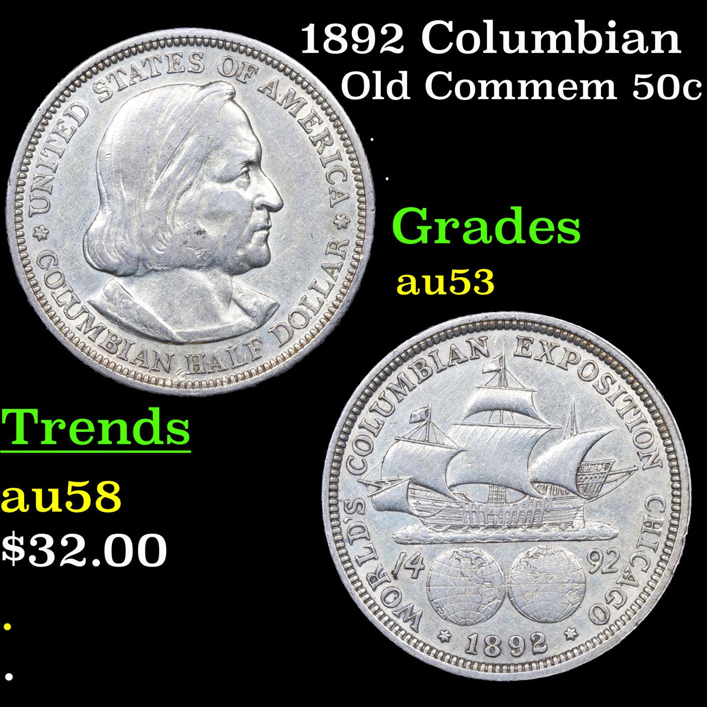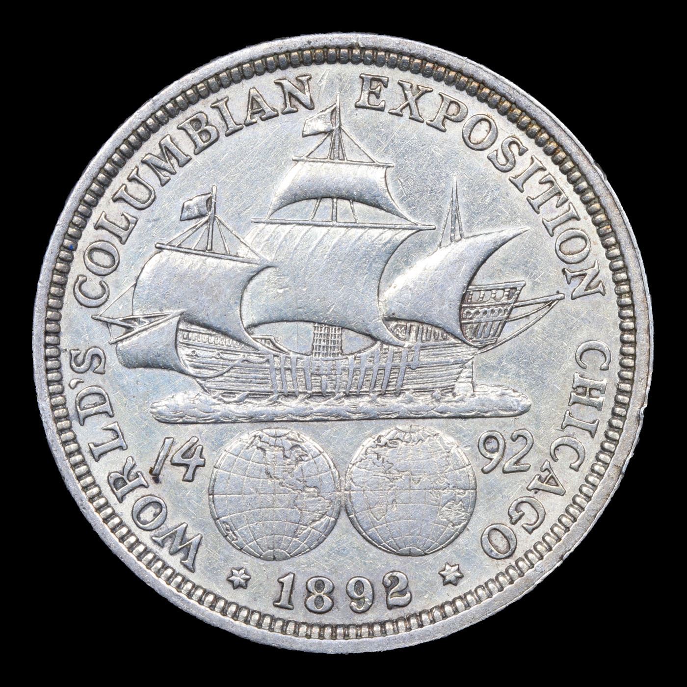 1892 Columbian Old Commem Half Dollar 50c Grades Select AU. The Columbus Half Dollar along with the Isabella Quarter were Minted in Honor of the 400th Anniversary of Columbus' Voyage to the New World. It was First Distributed at the Worlds Fair Honoring that Voyage. When Examining a Columbian Exposition Half Dollar, the First Points to Show Wear are Columbus’ Eyebrow, Cheek and the Hair Behind his Forehead and Jaw. On the Reverse, Check the Foresail and Sainsail, as well as the Right Side of the Eastern Hemisphere.