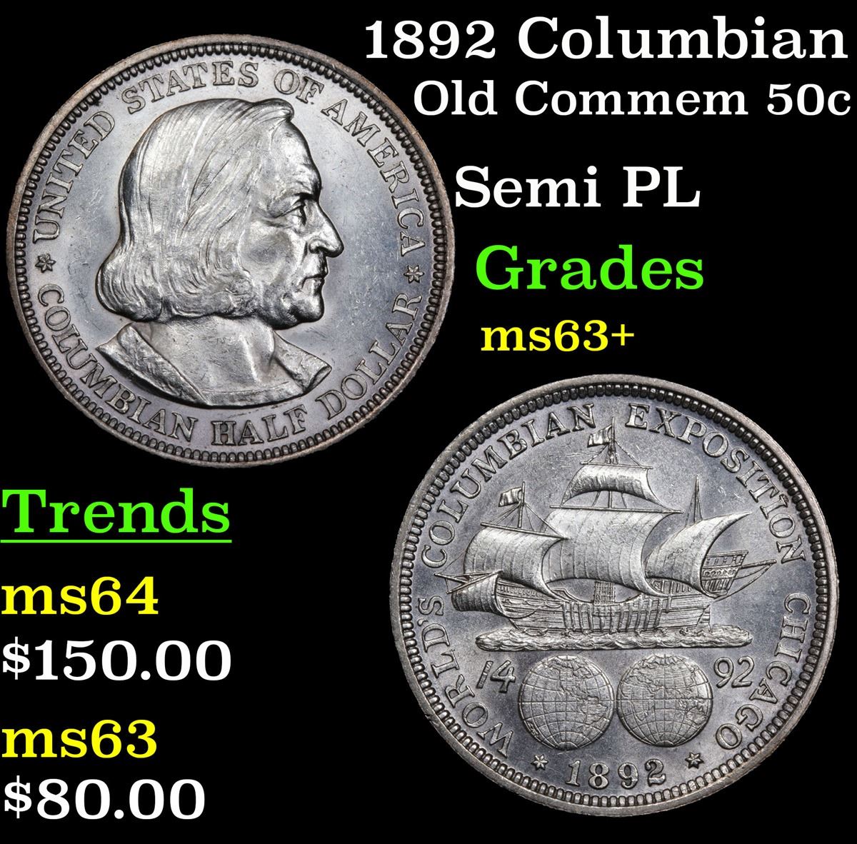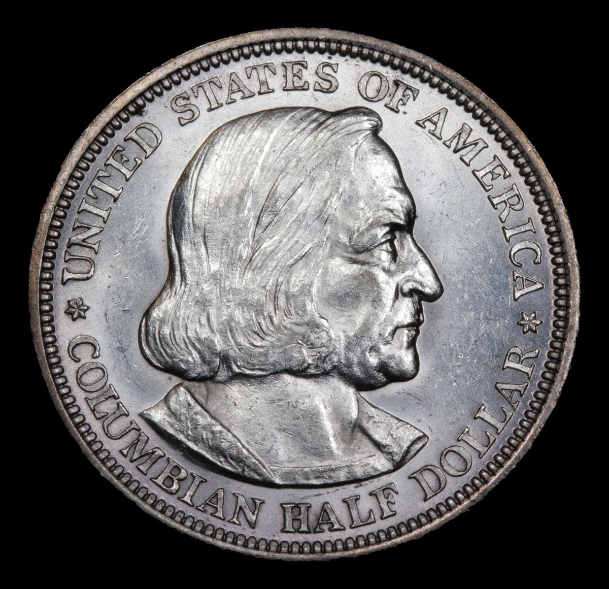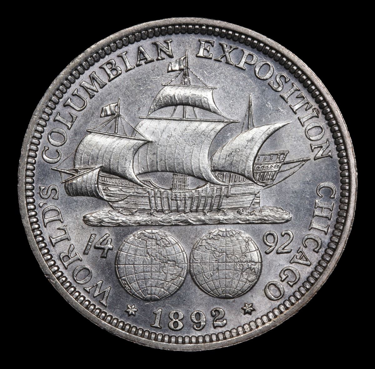 1892 Columbian Old Commem Half Dollar 50c Grades Select+ Unc. The Columbus Half Dollar along with the Isabella Quarter were Minted in Honor of the 400th Anniversary of Columbus' Voyage to the New World. It was First Distributed at the Worlds Fair Honoring that Voyage. When Examining a Columbian Exposition Half Dollar, the First Points to Show Wear are Columbus� Eyebrow, Cheek and the Hair Behind his Forehead and Jaw. On the Reverse, Check the Foresail and Sainsail, as well as the Right Side of the Eastern Hemisphere.