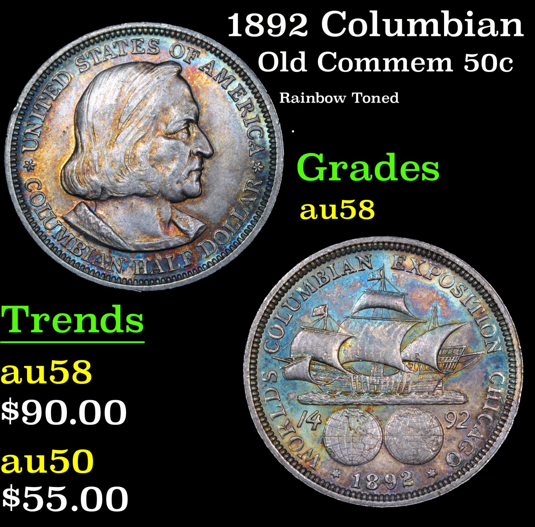 1892 Columbian Rainbow Toned . Old Commem Half Dollar 50c Grades Choice AU/BU Slider. The Columbus Half Dollar along with the Isabella Quarter were Minted in Honor of the 400th Anniversary of Columbus' Voyage to the New World. It was First Distributed at the Worlds Fair Honoring that Voyage. When Examining a Columbian Exposition Half Dollar, the First Points to Show Wear are ColumbusÕ Eyebrow, Cheek and the Hair Behind his Forehead and Jaw. On the Reverse, Check the Foresail and Sainsail, as well as the Right Side of the Eastern Hemisphere.