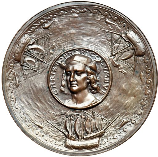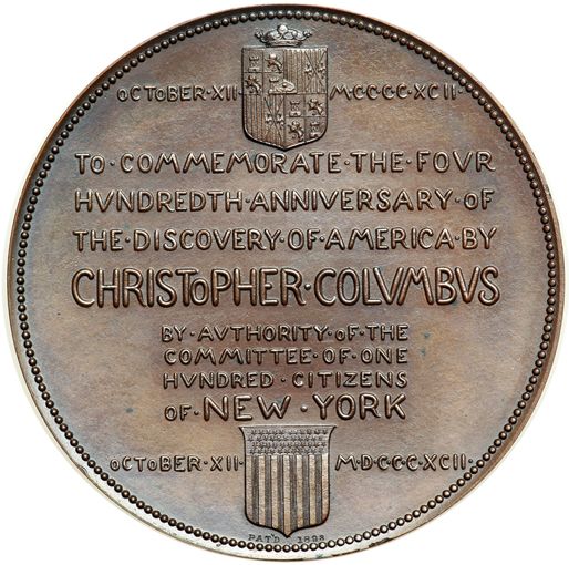 1892 Committee of One Hundred Citizens Medal with Original Box. Eglit-98A. MS-65 Brown. Bronze, 57mm. Obverse has youthful bust of Columbus at center with three caravels in ocean. Reverse has Spanish shield at top, American shield at bottom, and inscription in center. Issued to commemorate the 400th anniversary of the discovery of America by the Committee of One Hundred Citizens of New York. Uniform dark brown color with four or five tiny carbon spots on the obverse and reverse. Medal comes with its original brown cardboard box. An attractive and somewhat elusive piece.