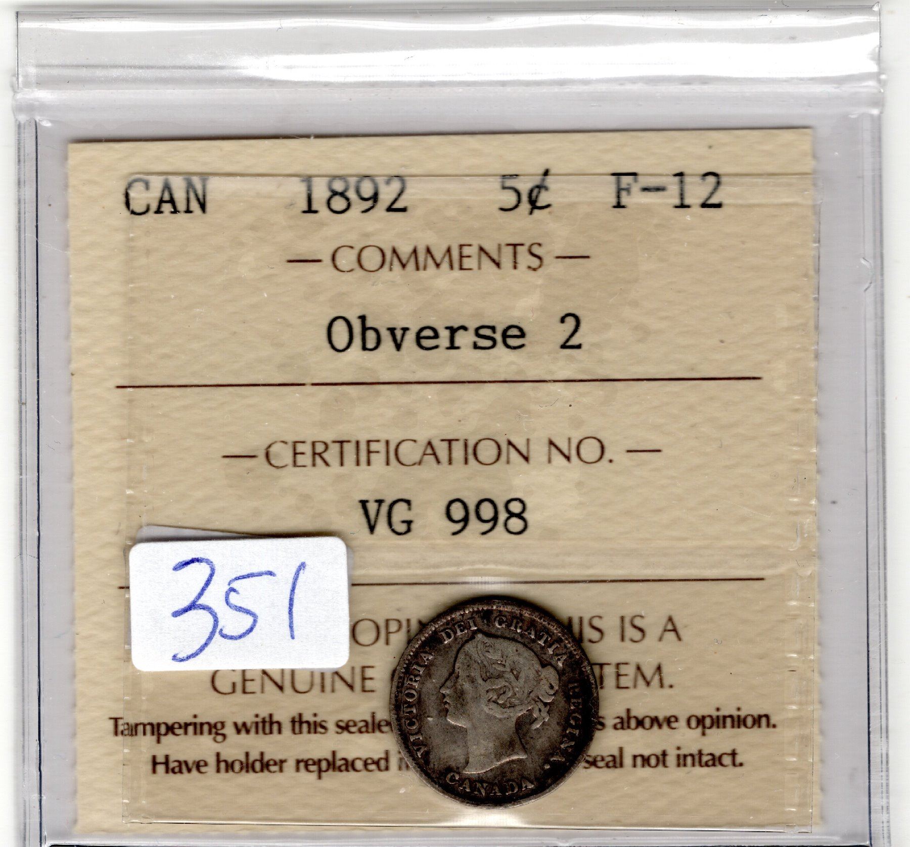 1892 FIVE CENTS OBVERSE 2 ICCS CERTIFIED