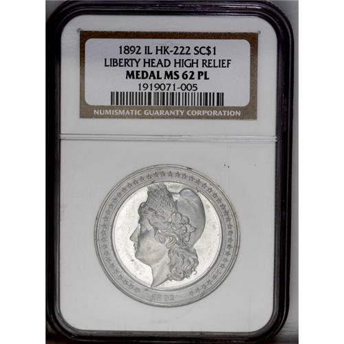 <B>1892 HK-222, Liberty Head High Relief, MS62 Prooflike NGC.</B></I> Medal issued to commemorate the Columbus 1492 discovery of America. This gorgeous high relief example has nice clean fields. Engraved by George T. Morgan.