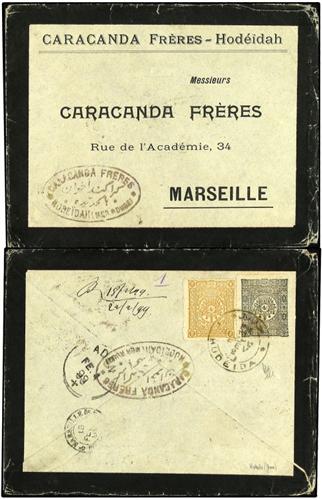 1892 HODEIDA a FRANCIA. Circulada con sellos de Turquia de 2 pi. naranja y sello de Tasas de 1 pi. negro (Sc. 98, J-40) mat. HODEIDA. Muy raro uso combinado de sellos de correo y tasas en Yemen. MUY RARA. Cert. HOLCOMBE.