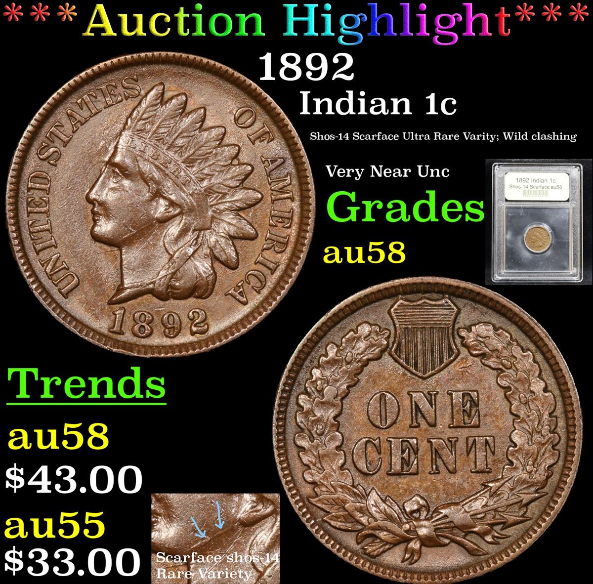 1892 Shos-14 Scarface Ultra Rare Varity; Wild clashing Very Near Unc Indian Cent 1c Graded Choice AU/BU Slider By USCG.