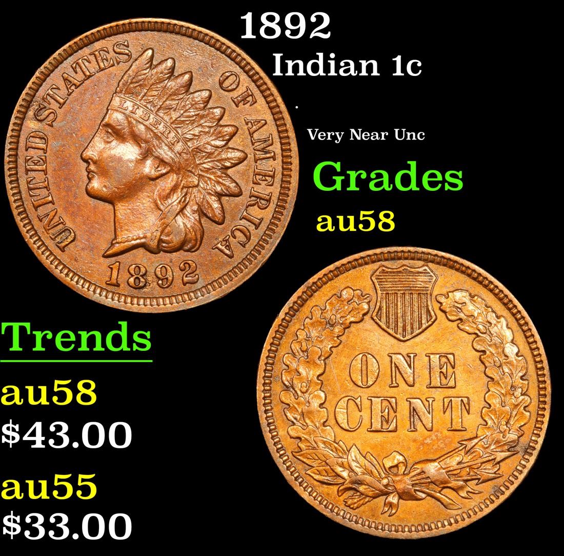 1892 . Very Near Unc Indian Cent 1c Grades Choice AU/BU Slider.