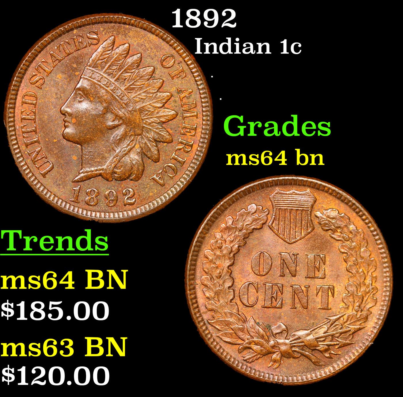 1892 Indian Cent 1c Grades Choice Unc BN.