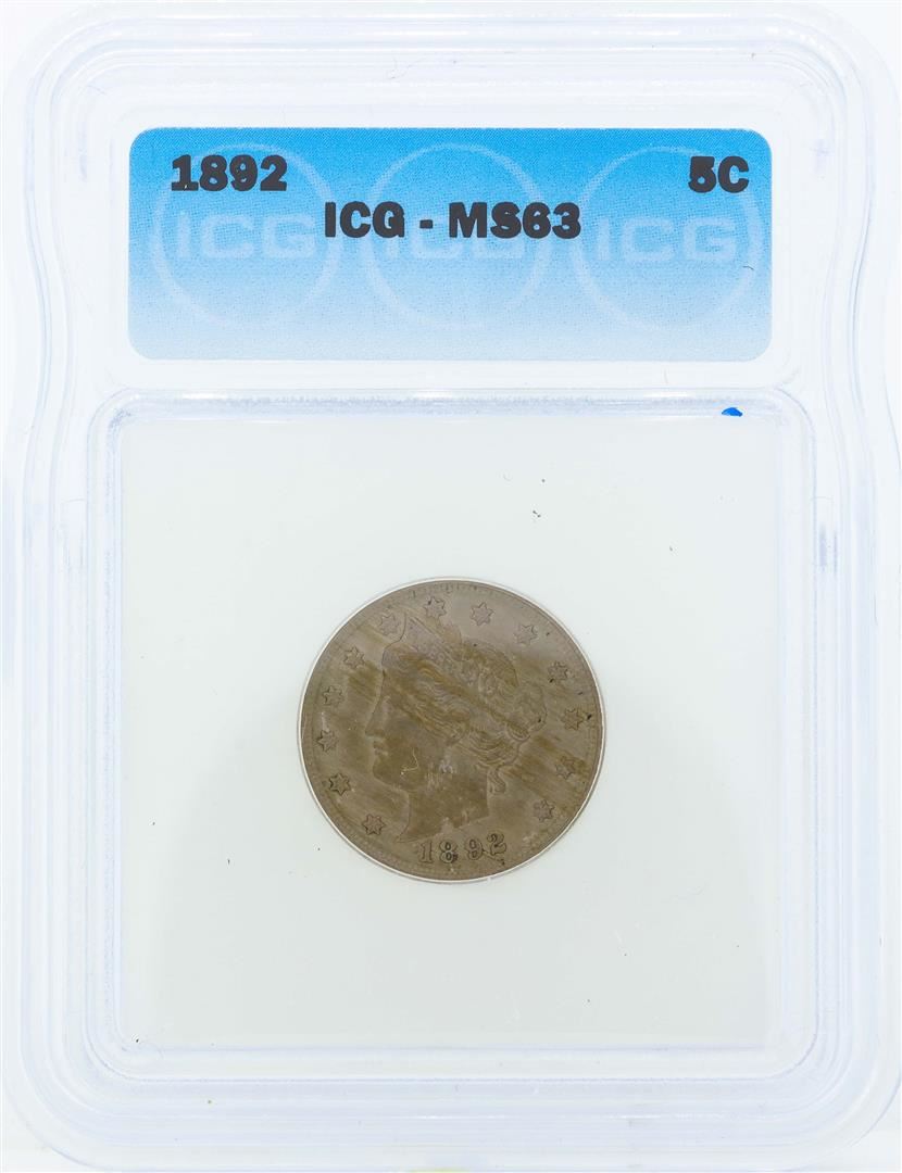 One 1892 Liberty Head Nickel Coin ICG MS63. ICG Appraised.