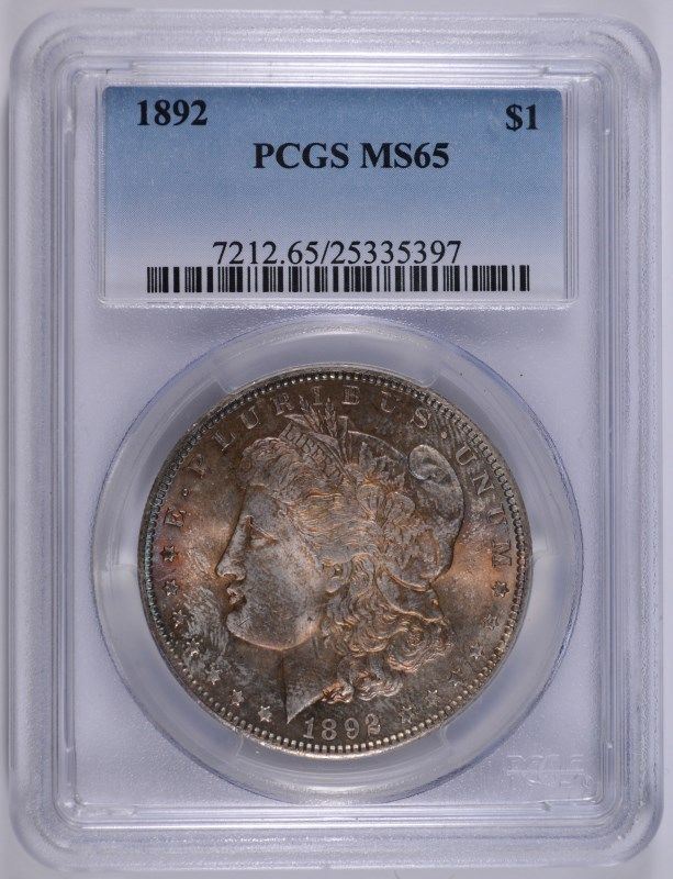 1892 MORGAN SILVER DOLLAR, PCGS MS-65 COLOR OBVERSE, WHITE REVERSE, RARE DATE!