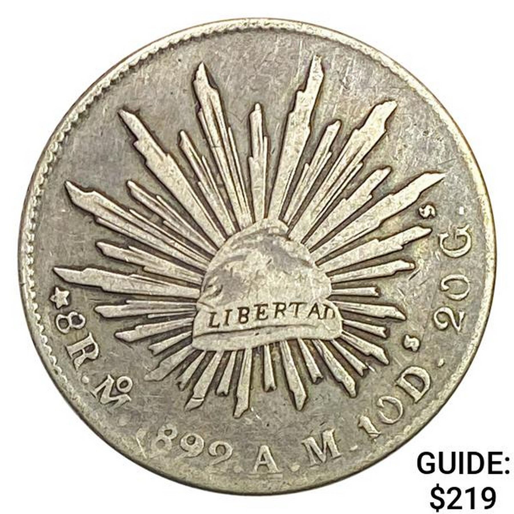 1892 Mo AM Mexico Silver 8 Reales Cap&Ray NEARLY UNCIRCULATED