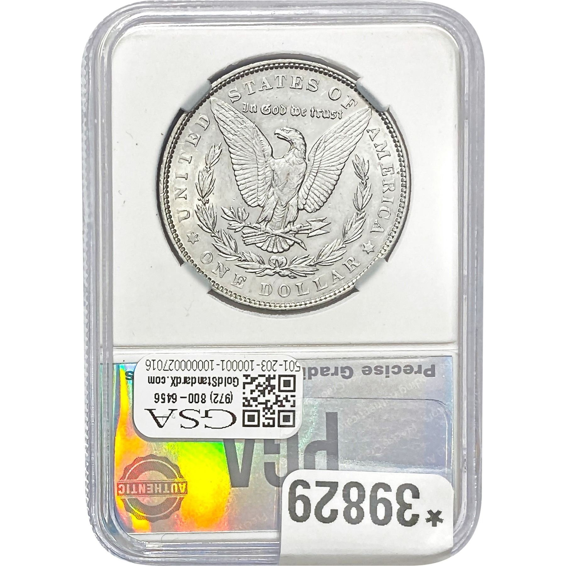 COINS AND CURRENCY LISTED IN GSA’S CATALOG AS GRADED AND ENCAPSULATED BY PCGS, NGC, ANACS, ICG, PCGS CURRENCY, PMG, PCGS BANKNOTE GRADING, CMC OR ANY OTHER THIRD-PARTY GRADING SERVICE ARE LIKEWISE SOLD “AS-IS” EXCEPT AS EXPRESSLY SET FORTH HEREIN. ALL THIRD-PARTY GRADING SERVICE GUARANTEES, INCLUDING AUTHENTICITY, ARE THE SOLE RESPONSIBILITY OF THE THIRD-PARTY GRADING SERVICE AND NOT WARRANTIES OR GUARANTEES OF GSA. BIDDERS SHOULD CONTACT THESE THIRD-PARTY GRADING SERVICES DIRECTLY WITH RESPECT TO ANY CLAIMS OR QUESTIONS THEY MAY HAVE CONCERNING THEIR GUARANTEES AND WARRANTIES. BIDDERS ACKNOWLEDGE AND AGREE THAT AUCTIONEER IS NOT BOUND BY OR LIABLE FOR ANY OPINION OR CERTIFICATION BY ANY THIRD-PARTY GRADING SERVICE. REMOVAL OF A PRODUCT FROM ITS PROTECTIVE CASING OR HOLDER OR ALTERATION OF ANY COIN HOLDER WAIVES ALL RIGHTS CONCERNING THE PRODUCT CONTAINED THEREIN.