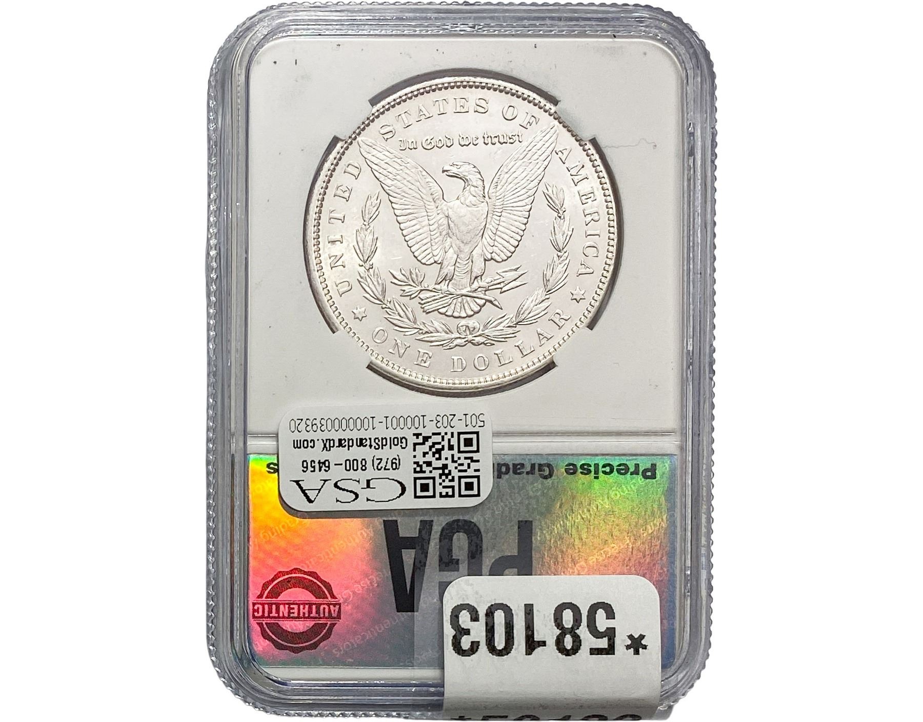 e. Coins sold referencing a third-party grading service are sold “AS IS” without any express or implied warranty, except for a guarantee by GSA that they are genuine. Removal or alteration of the holder, voids all of Bidder’s claims concerning that Product. Certain warranties may be available from the grading services and Bidders are referred to them for further details: Numismatic Guaranty Corporation (NGC), PO Box 4776, Sarasota, FL 34230, www.ngccoin.com/services/writtenguarantee.asp; Professional Coin Grading Services (PCGS), PO Box 9458, Newport Beach, CA 92658, www.pcgs.com/guarantee.html; ANACS, 6555 S. Kenton St., Ste. 303, Englewood, CO 80111; and Independent Coin Grading Co. (ICG), 7901 East Bellview, Ave., Suite 50, Englewood, CO 80111.