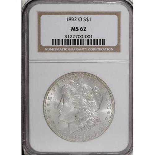 <B>1892-O $1 MS62 NGC.</B></I> . NGC Census: (504/2426). PCGS Population (854/3534). Mintage: 2,744,000. Numismedia Wsl. Price for NGC/PCGS coin in MS62: $200. (#7216)<BR><BR><B>Coin Engraver:</B> George T. Morgan<BR><BR><b>Shipping:</b> Coins & Currency (<a target="_blank" href="http://www.heritageauctions.com/common/shipping.php">view shipping information</a>)