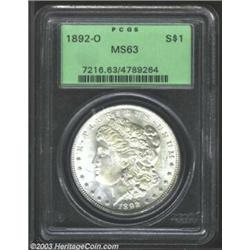 <TR><TD width="100%"><TABLE cellSpacing=1 cellPadding=3 width="100%" border=0><TBODY><TR><TD width="100%" bgColor=#79735c><FONT face=arial color=#ffffff size=3><B>Description</B> </FONT></TD></TR><TR><TD width="100%" bgColor=#ffffff><FONT face=arial size=2><B>1892-O $1 MS63 PCGS.</B></I> Milky tan patina embraces the devices of this lustrous and nicely struck example. The reverse is well preserved, but a pinscratch in the lower left obverse field prevents a higher designation. </FONT></TD></TR></TBODY></TABLE></TD></TR></TBODY></TABLE><BR><A name=PricesRealized></A><TABLE cellSpacing=0 cellPadding=0 width="100%" bgColor=#000000 border=0><TBODY><TR><TD width="100%"><TABLE cellSpacing=1 cellPadding=3 width="100%" border=0><TBODY><TR><TD width="100%" bgColor=#79735c><A name=PR><FONT face=arial color=#ffffff size=3><B>Previous Prices from Heritage Auctions</B> </FONT></A></TD></TR><TR><TD bgColor=#f6f6ed><TABLE cellSpacing=0 cellPadding=0 width="100%" border=1><TBODY><TR><TD align=middle width="33%"><B>Date</B></TD><TD align=middle width="33%"><B>Service</B></TD><TD align=middle width="33%"><B>Price</B></TD></TR><TR bgColor=whitesmoke><TD width="33%"><B>11/25/2002</B></TD><TD width="33%">PCGS</TD><TD width="33%">$212.75</TD></TR><TR bgColor=whitesmoke><TD width="33%"><B>09/30/2002</B></TD><TD width="33%">PCGS</TD><TD width="33%">$264.50</TD></TR><TR bgColor=whitesmoke><TD width="33%"><B>09/03/2002</B></TD><TD width="33%">PCGS</TD><TD width="33%">$189.75</TD></TR><TR bgColor=whitesmoke><TD width="33%"><B>07/29/2002</B></TD><TD width="33%">PCGS</TD><TD width="33%">$207.00</TD></TR><TR bgColor=whitesmoke><TD width="33%"><B>07/29/2002</B></TD><TD width="33%">PCGS</TD><TD width="33%">$184.00</TD></TR><TR bgColor=whitesmoke><TD width="33%"><B>07/29/2002</B></TD><TD width="33%">PCGS</TD><TD width="33%">$218.50</TD></TR><TR bgColor=whitesmoke><TD width="33%"><B>06/10/2002</B></TD><TD width="33%">PCGS</TD><TD width="33%">$207.00</TD></TR><TR bgColor=whitesmoke><TD width="33%"><B>04/09/2002</B></TD><TD width="33%">PCGS</TD><TD width="33%">$201.25</TD></TR><TR bgColor=whitesmoke><TD width="33%"><B>02/19/2002</B></TD><TD width="33%">PCGS</TD><TD width="33%">$195.50</TD></TR><TR bgColor=whitesmoke><TD width="33%"><B>02/12/2002</B></TD><TD width="33%">PCGS</TD><TD width="33%">$189.75</TD></TR><TR bgColor=whitesmoke><TD width="33%"><B>01/25/2000</B></TD><TD width="33%">PCGS</TD><TD width="33%">$170.00</TD></TR><TR bgColor=whitesmoke><TD width="33%"><B>11/18/2000</B></TD><TD width="33%">PCGS</TD><TD width="33%">$172.50</TD></TR><TR bgColor=whitesmoke><TD width="33%"><B>11/19/1999</B></TD><TD width="33%">PCGS</TD><TD width="33%">$207.00</TD></TR><TR bgColor=whitesmoke><TD width="33%"><B>06/05/1999</B></TD><TD width="33%">PCGS</TD><TD width="33%">$187.00</TD></TR><TR bgColor=whitesmoke><TD width="33%"><B>03/16/1996</B></TD><TD width="33%">PCGS</TD><TD width="33%">$154.00</TD></TR><TR bgColor=whitesmoke><TD width="33%"><B>02/27/2001</B></TD><TD width="33%">PCGS</TD><TD width="33%">$170.00</TD></TR><TR bgColor=whitesmoke><TD width="33%"><B>02/13/2001</B></TD><TD width="33%">PCGS</TD><TD width="33%">$180.00</TD></TR><TR bgColor=whitesmoke><TD width="33%"><B>06/05/2001</B></TD><TD width="33%">PCGS</TD><TD width="33%">$200.00</TD></TR><TR bgColor=whitesmoke><TD width="33%"><B>06/13/2000</B></TD><TD width="33%">PCGS</TD><TD width="33%">$220.00</TD></TR><TR bgColor=whitesmoke><TD width="33%"><B>04/18/2000</B></TD><TD width="33%">PCGS</TD><TD width="33%">$190.00</TD></TR><TR bgColor=whitesmoke><TD width="33%"><B>08/07/2000</B></TD><TD width="33%">PCGS</TD><TD width="33%">$333.50</TD></TR><TR bgColor=whitesmoke><TD width="33%"><B>08/14/1999</B></TD><TD width="33%">PCGS</TD><TD width="33%">$258.75</TD></TR><TR bgColor=whitesmoke><TD width="33%"><B>06/05/1999</B></TD><TD width="33%">PCGS</TD><TD width="33%">$198.00</TD></TR><TR bgColor=whitesmoke><TD width="33%"><B>08/08/1998</B></TD><TD width="33%">PCGS</TD><TD width="33%">$132.00</TD></TR><TR bgColor=whitesmoke><TD width="33%"><B>09/09/1994</B></TD><TD width="33%">PCGS</TD><TD width="33%">$148.50</TD></TR><TR bgColor=whitesmoke><TD width="33%"><B>05/06/1994</B></TD><TD width="33%">PCGS</TD><TD width="33%">$154.00</TD></TR><TR bgColor=whitesmoke><TD width="33%"><B>01/09/1999</B></TD><TD width="33%">PCGS</TD><TD width="33%">$242.00</TD></TR><TR bgColor=whitesmoke><TD width="33%"><B>08/08/1998</B></TD><TD width="33%">PCGS</TD><TD width="33%">$143.00</TD></TR><TR bgColor=whitesmoke><TD width="33%"><B>04/26/1996</B></TD><TD width="33%">PCGS</TD><TD width="33%">$187.00</TD></TR><TR bgColor=whitesmoke><TD width="33%"><B>07/26/1994</B></TD><TD width="33%">PCGS</TD><TD width="33%">$165.00</TD></TR><TR bgColor=whitesmoke><TD width="33%"><B>02/05/1994</B></TD><TD width="33%">PCGS</TD><TD width="33%">$176.00</TD></TR><TR bgColor=whitesmoke><TD width="33%"><B>01/13/2002</B></TD><TD width="33%">PCGS</TD><TD width="33%">$173.65</TD></TR><TR bgColor=whitesmoke><TD width="33%"><B>12/11/2001</B></TD><TD width="33%">PCGS</TD><TD width="33%">$255.00</TD></TR><TR bgColor=whitesmoke><TD width="33%"><B>11/06/2001</B></TD><TD width="33%">PCGS</TD><TD width="33%">$185.00</TD></TR><TR bgColor=whitesmoke><TD width="33%"><B>02/24/2001</B></TD><TD width="33%">PCGS</TD><TD width="33%">$241.50</TD></TR><TR bgColor=whitesmoke><TD width="33%"><B>01/23/2001</B></TD><TD width="33%">PCGS</TD><TD width="33%">$185.00</TD></TR><TR bgColor=whitesmoke><TD width="33%"><B>12/19/2000</B></TD><TD width="33%">PCGS</TD><TD width="33%">$195.00</TD></TR><TR bgColor=whitesmoke><TD width="33%"><B>01/09/1999</B></TD><TD width="33%">PCGS</TD><TD width="33%">$187.00</TD></TR><TR bgColor=whitesmoke><TD width="33%"><B>03/01/2003</B></TD><TD width="33%">PCGS</TD><TD width="33%">$310.50</TD></TR><TR bgColor=whitesmoke><TD width="33%"><B>04/28/2002</B></TD><TD width="33%">NGC</TD><TD width="33%">$178.25</TD></TR><TR bgColor=whitesmoke><TD width="33%"><B>03/05/2002</B></TD><TD width="33%">NGC</TD><TD width="33%">$189.75</TD></