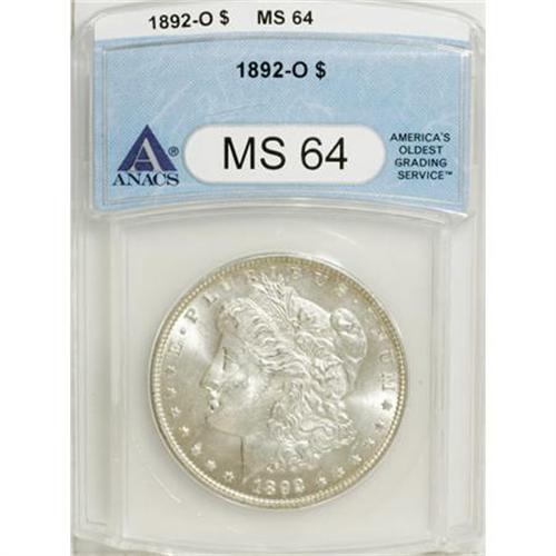 <B>1892-O $1 MS64 ANACS.</B></I> NGC Census: (1050/74). PCGS Population (1340/141). Mintage: 2,744,000. Numismedia Wsl. Price for NGC/PCGS coin in MS64: $600. (#7216)<BR><BR><B>Coin Engraver:</B> George T. Morgan<BR><BR><b>Shipping:</b> Coins & Currency (<a target="_blank" href="http://www.heritageauctions.com/common/shipping.php">view shipping information</a>\)