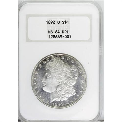 <B>1892-O $1 MS64 Deep Mirror Prooflike NGC.</B></I> The 1892-O is very rare as either Prooflike or Deep Mirror Prooflike. NGC has certified only 10 pieces as Prooflike, three in AU grades, and only seven pieces as Deep Mirror Prooflike, two of which grade AU58. NGC has yet to grade any pieces MS65 or finer as Prooflike or Deep Mirror Prooflike. Sharply struck for a New Orleans dollar from this era, and the flashy fields display light milk-gray and gold toning. There are surprisingly few marks. Housed in a prior generation holder. Census: 2 in 64 DMPL, 0 finer (5/07).<BR><BR><b>Shipping:</b> Coins & Currency (<a target="_blank" href="http://www.heritageauctions.com/common/shipping.php">view shipping information</a>)