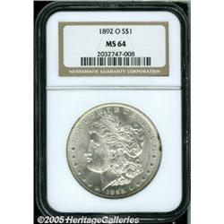 <B>1892-O<img border='0' src='http://www.heritagecoins.com/images/star.gif' width=10 height=10>$1 MS64 NGC.</B></I> Sharply defined for this normally weak issue, the surfaces are mostly brilliant with only the slightest marks and luster grazes evident on Liberty's cheek.