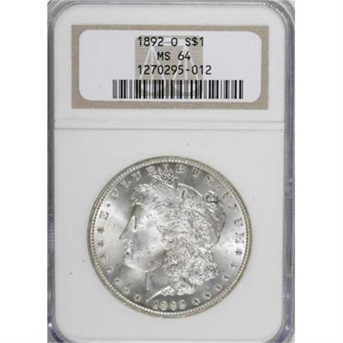 <B>1892-O $1 MS64 NGC.</B></I> NGC Census: (1056/74). PCGS Population (1363/145). Mintage: 2,744,000. Numismedia Wsl. Price for NGC/PCGS coin in MS64: $600. (#7216)<BR><BR><B>Coin Engraver:</B> George T. Morgan<BR><BR><b>Shipping:</b> Coins & Currency (<a target="_blank" href="http://www.heritageauctions.com/common/shipping.php">view shipping information</a>)