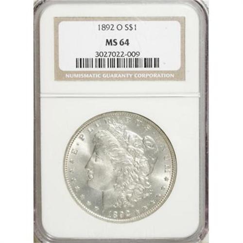 <B>1892-O $1 MS64 NGC.</B></I> Highly lustrous surfaces display touches of light tan color, and are devoid of significant abrasions. The centers are lightly struck, as is usual for the majority of '92-O dollars. Faint as-made roller marks occur on each side.<BR><BR><B>Coin Engraver:</B> George T. Morgan<BR><BR><b>Shipping:</b> Coins & Currency (<a target="_blank" href="http://www.heritageauctions.com/common/shipping.php">view shipping information</a>)