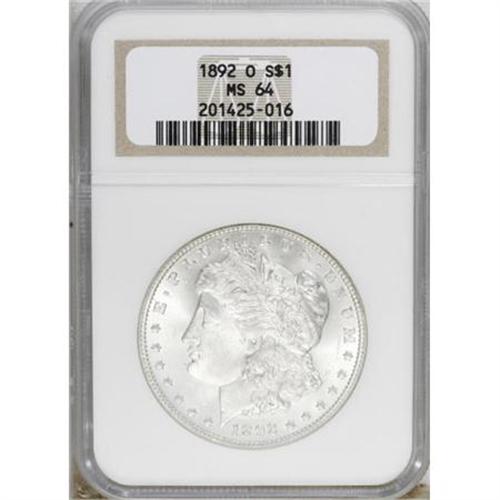 <B>1892-O $1 MS64 NGC.</B></I> NGC Census: (1067/78). PCGS Population (1415/156). Mintage: 2,744,000. Numismedia Wsl. Price for NGC/PCGS coin in MS64: $580. (#7216)<BR><BR><B>Coin Engraver:</B> George T. Morgan<BR><BR><b>Shipping:</b> Coins & Currency (<a target="_blank" href="http://www.heritageauctions.com/common/shipping.php">view shipping information</a>)