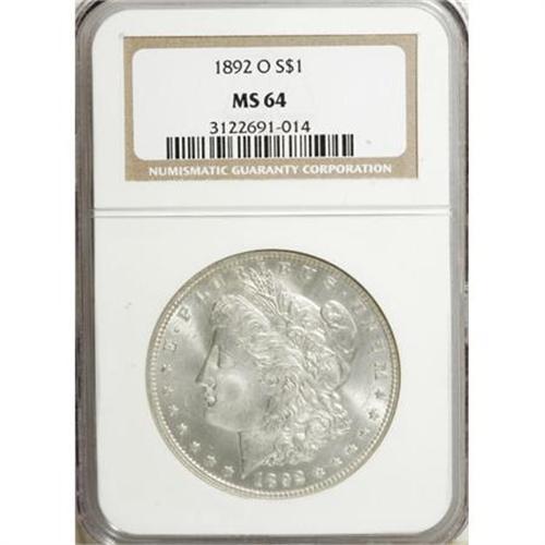 <B>1892-O $1 MS64 NGC.</B></I> Close to fully struck, this lovely piece has frosty silver luster with fully brilliant, untoned obverse and reverse surfaces. It is an exceptional piece for the grade.<BR><BR><B>Coin Engraver:</B> George T. Morgan<BR><BR><b>Shipping:</b> Coins & Currency (<a target="_blank" href="http://www.heritageauctions.com/common/shipping.php">view shipping information</a>)