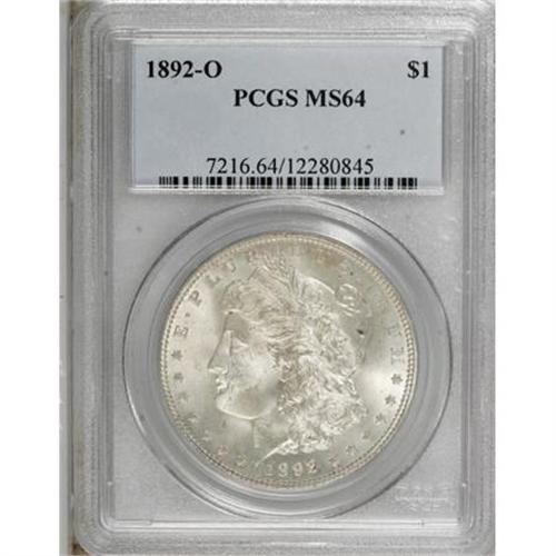 <B>1892-O $1 MS64 PCGS.</B></I> . PCGS Population (1424/158). NGC Census: (1071/82). Mintage: 2,744,000. Numismedia Wsl. Price for NGC/PCGS coin in MS64: $590. (#7216)<BR><BR><B>Coin Engraver:</B> George T. Morgan<BR><BR><b>Shipping:</b> Coins & Currency (<a target="_blank" href="http://www.heritageauctions.com/common/shipping.php">view shipping information</a>)