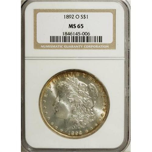 <B>1892-O $1 MS65 NGC.</B></I> Orange-gold patination encircles the peripheries of this Gem O-mint representative, being somewhat more intense on the obverse. The strike is above average for this notoriously poorly struck issue; some definition is apparent in the eagle's breast feathers, though the hair at Liberty's ear is soft. The surfaces possess nice luster and are quite well preserved for the grade.<BR><I>From the Reuben Reinstein Collection.</B></I><BR><BR><b>Shipping:</b> Coins & Currency (<a target="_blank" href="http://www.heritageauctions.com/common/shipping.php">view shipping information</a>)