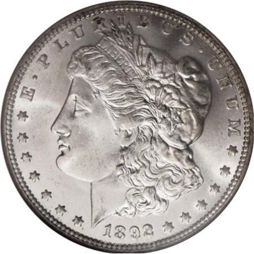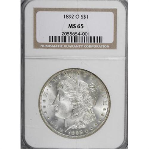 <B>1892-O $1 MS65 NGC.</B></I> Intense coruscating mint frost shines over each side of this conditionally scarce Gem dollar from the New Orleans Mint. The design elements are generally bold, but typical softness is noted above the ear and on the eagle's breast feathers. Other than a few small grease specks (as struck) the surfaces of this bright example are snow-white and untoned. Census: 70 in 65, 4 finer (8/07). <BR><BR><B>Coin Engraver:</B> George T. Morgan<BR><BR><b>Shipping:</b> Coins & Currency (<a target="_blank" href="http://www.heritageauctions.com/common/shipping.php">view shipping information</a>)