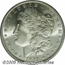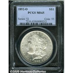 <B>1892-O<img border='0' src='http://www.heritagecoins.com/images/star.gif' width=10 height=10>$1 MS65 PCGS.</B></I> Although this is a relatively common date, especially in relation to other Morgan dollar issues from the early and mid 1890s, Gem quality examples are seldom seen. In fact, PCGS has only certified five finer coins. This example is sharply struck and fully lustrous without toning on either side. It is a fully brilliant Gem with pristine surfaces. The collector of Gem quality Morgan Silver Dollars would be well served by an aggressive bid for this example.