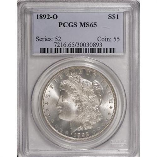 <B>1892-O $1 MS65 PCGS.</B></I> Thoroughly lustrous with frosty silver surfaces and exceptional eye appeal. The 1892-O is a scarce date in all Mint State grades, and a rarity in Gem condition. The quality of strike adds to the overall importance of this Gem. The centers lack full design detail, but the sharpness is above average. Only five finer examples have been certified by PCGS with higher numerical grades (1/07).<BR><I>From The Oxford Collection.</B></I><BR><BR><B>Coin Engraver:</B> George T. Morgan<BR><BR><b>Shipping:</b> Coins & Currency (<a target="_blank" href="http://www.heritageauctions.com/common/shipping.php">view shipping information</a>)