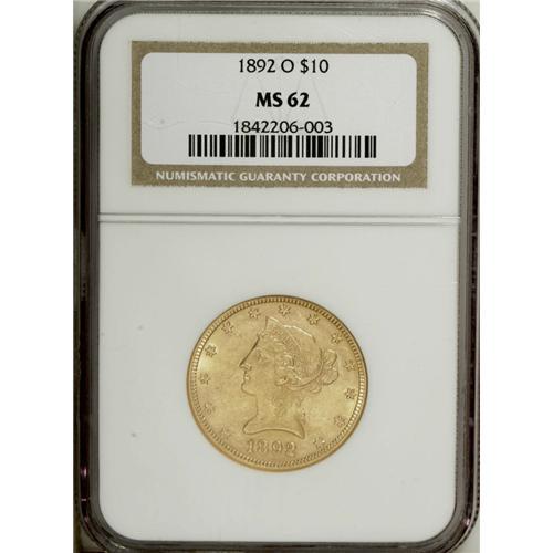 <B>1892-O $10 MS62 NGC.</B></I> Well struck with pleasing luster, though light to moderate abrasions pepper the yellow-gold surfaces. An excellent choice for the collector who desires a Mint State New Orleans eagle, and tied for the finest example certified by NGC (11/06).<BR><BR><b>Shipping:</b> Coin/Currency (<a target="_blank" href="http://www.heritageauctions.com/common/shipping.php">view shipping information</a>)
