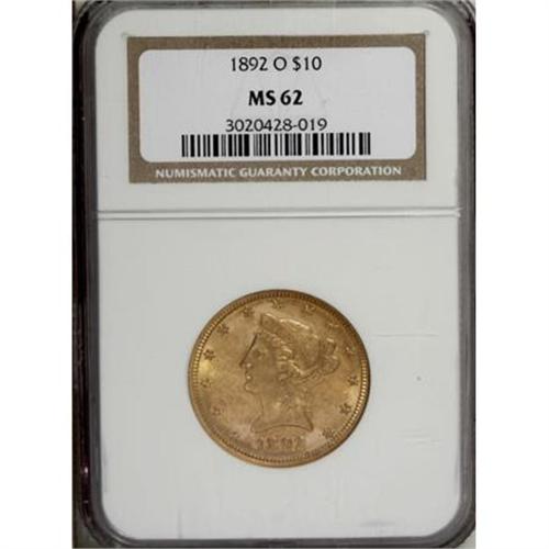 <B>1892-O $10 MS62 NGC.</B></I> The 1892-O is a conditionally challenging issue with a mintage of only 28,688 pieces. Most '92-O eagles are notably bagmarked, but the present example has a clean portrait and reverse along with relatively few obverse field marks.<BR><BR><B>Coin Engraver:</B> Christian Gobrecht<BR><BR><b>Shipping:</b> Coins & Currency (<a target="_blank" href="http://www.heritageauctions.com/common/shipping.php">view shipping information</a>\)