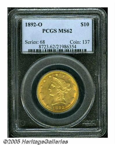 <B>1892-O<$10> MS62 PCGS.</B></I> Deep red-orange golden surfaces with nice luster and the obligatory for the grade abrasions mostly minor, scattered, and in the fields.