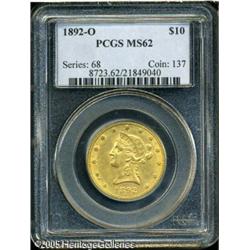 <B>1892-O $10 MS62 PCGS.</B></I> Very scarce, with a mintage of just 28,688 pieces. This issue becomes very difficult in MS60 and above. It is estimated that only between 100 and 120 pieces are extant in Mint State. PCGS shows only 57 graded at the MS62 level, with one example certified higher(1/05). Moreover, most coins of this issue are flat at the first six stars, in the hair around Liberty's ear, and in the letters of UNITED. This example, while soft in the centers of the stars along the left border, has fairly good definition in the hair around Liberty's ear, and is quite strong in the letters of UNITED. Pleasing honey-gold surfaces display a few minute marks over each side, none of which are serious. Lot:8799