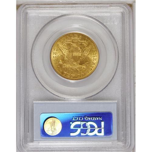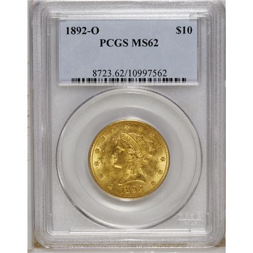 <B>1892-O $10 MS62 PCGS.</B></I> Well struck and frosty with light abrasions and a few copper spots on the yellow-gold obverse. While most survivors are high-grade, it is difficult to find a finer coin; NGC has awarded no examples a higher grade, and PCGS has graded just three finer (10/06).<BR><BR><b>Shipping:</b> Coin/Currency (<a target="_blank" href="http://www.heritageauctions.com/common/shipping.php">view shipping information</a>)