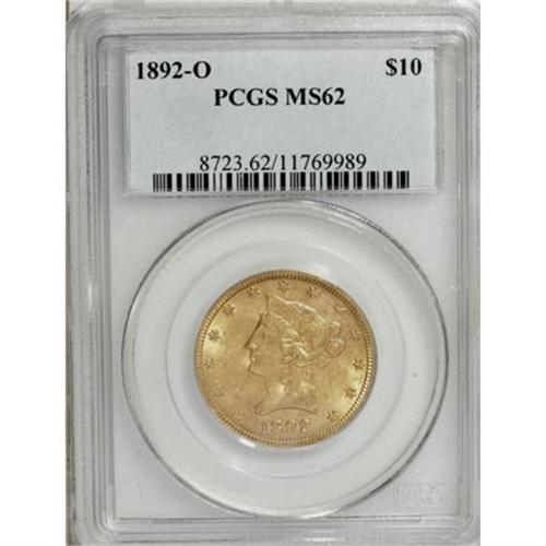 <B>1892-O $10 MS62 PCGS.</B></I> A strongly lustrous and lightly abraded citrus-yellow piece that offers strong central detail, though the stars show slight softness. More elusive than the population figures suggest, for the numbers are inflated by resubmissions. For this issue, MS62 is the highest grade assigned by NGC, and PCGS has certified only four coins finer (7/07).<BR><BR><B>Coin Engraver:</B> Christian Gobrecht<BR><BR><b>Shipping:</b> Coins & Currency (<a target="_blank" href="http://www.heritageauctions.com/common/shipping.php">view shipping information</a>\)