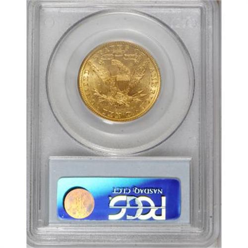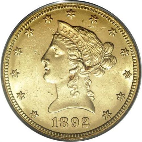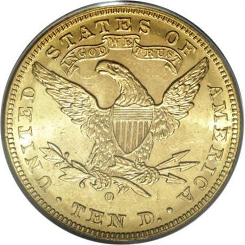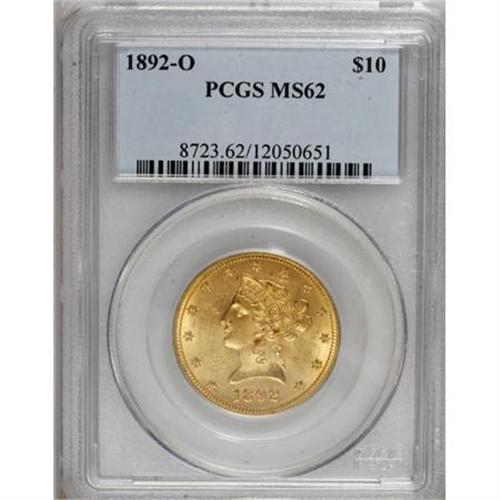 <B>1892-O $10 MS62 PCGS.</B></I> Despite its low mintage of 28,688 pieces, the 1892-O is available in Mint State through MS62, at which point the population drops precipitously, as evidenced by the PCGS/NGC population figures. A mere four pieces grading higher have been seen by the former service, and none by NGC. The lustrous peach-gold surfaces of the present coin exhibit well struck design elements, and reveal a few grade-defining marks.<BR><BR><B>Coin Engraver:</B> Christian Gobrecht<BR><BR><b>Shipping:</b> Coins & Currency (<a target="_blank" href="http://www.heritageauctions.com/common/shipping.php">view shipping information</a>)