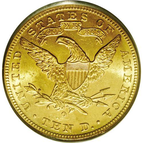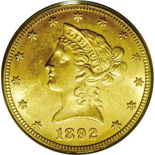 <B>1892-O<$10> MS63 PCGS.</B></I> The 1892-O is one of the most frustrating issues to collect within the Liberty eagle series. Mint State pieces are available. In fact, PCGS has certified 278 pieces in MS60 and better grades, and the PCGS population is 100 at the MS62 level. But none have been graded above MS63 by either NGC or PCGS, and only two PCGS pieces and a single NGC coin have achieved the MS63 grade. The typical 1892-O is inundated with small marks, which sometimes impair the field luster. The present piece is a rare exception. Not only is the luster undiminished, but abrasions are limited in quantity and severity. A significant opportunity for the New Orleans specialist.