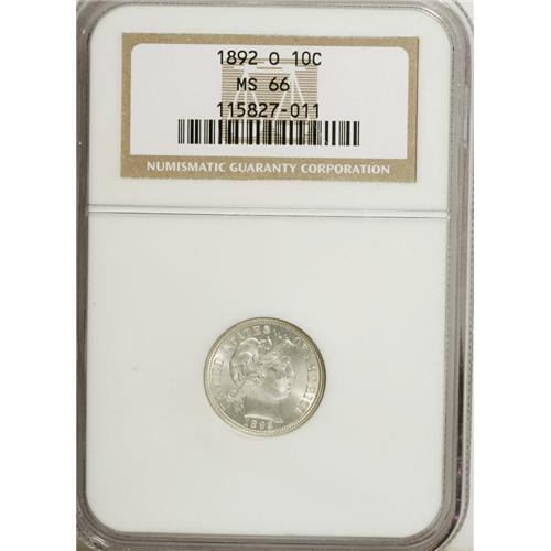 <B>1892-O 10C MS66 NGC.</B></I> Well struck and brilliant, with vibrant luster and outstanding surface preservation. An unusually clean and attractive first-year example from the New Orleans Mint. Census: 8 in 66, 2 finer (4/07).<BR><BR><b>Shipping:</b> Coins & Currency (<a target="_blank" href="http://www.heritageauctions.com/common/shipping.php">view shipping information</a>)