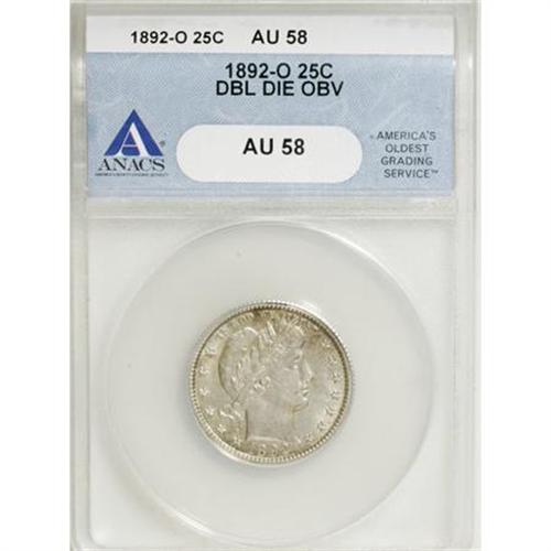 <B>1892-O 25C Double Die Obverse AU58 ANACS.</B></I> NGC Census: (56/247). PCGS Population (64/265). Mintage: 2,640,000. Numismedia Wsl. Price for NGC/PCGS coin in AU58: $195. (#5602)<BR><BR><B>Coin Engraver:</B> Charles E. Barber<BR><BR><b>Shipping:</b> Coins & Currency (<a target="_blank" href="http://www.heritageauctions.com/common/shipping.php">view shipping information</a>)