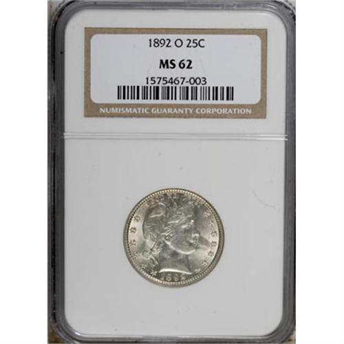 <B>1892-O 25C MS62 NGC.</B></I> NGC Census: (44/176). PCGS Population (59/175). Mintage: 2,640,000. Numismedia Wsl. Price for NGC/PCGS coin in MS62: $300. (#5602)<BR><BR><B>Coin Engraver:</B> Charles E. Barber<BR><BR><b>Shipping:</b> Coins & Currency (<a target="_blank" href="http://www.heritageauctions.com/common/shipping.php">view shipping information</a>)
