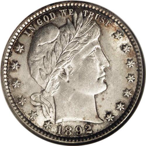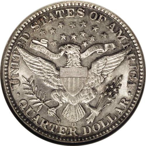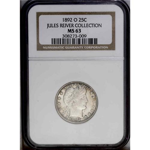 <B>1892-O<25C> MS63 NGC.</B></I> Type One Reverse. A lustrous first year Barber Quarter, delicately toned near the margins in tan-brown tints. Sharply struck, and the portrait and reverse are quite clean for the Select grade. A couple of minor luster grazes in the lower right obverse field prevent a higher numerical assessment. The introductory Type One Reverse shows the middle serif of the E in UNITED; this design feature is completely covered by the wing for the Type Two subtype, used for the remainder of the series.