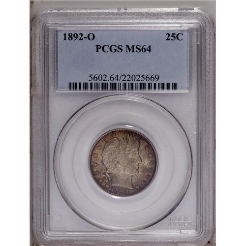 <B>1892-O<25C> MS64 PCGS.</B></I> Type Two Reverse. Lightly die doubled on IN GOD. Richly patinated in orange-gold, lime, and pearl-gray shades. A well struck and satiny first year New Orleans Barber quarter with refreshingly unscathed surfaces.
